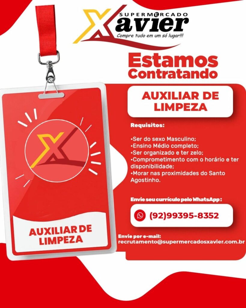 Xavier supermercado seleciona Auxiliar de limpeza, Operador (a) de caixa, Auxiliar de açougue, Açougueiro, Peixeiro, Confeiteiro; Envie seu currículo!
