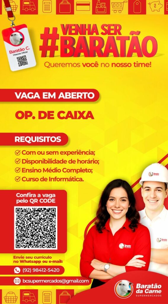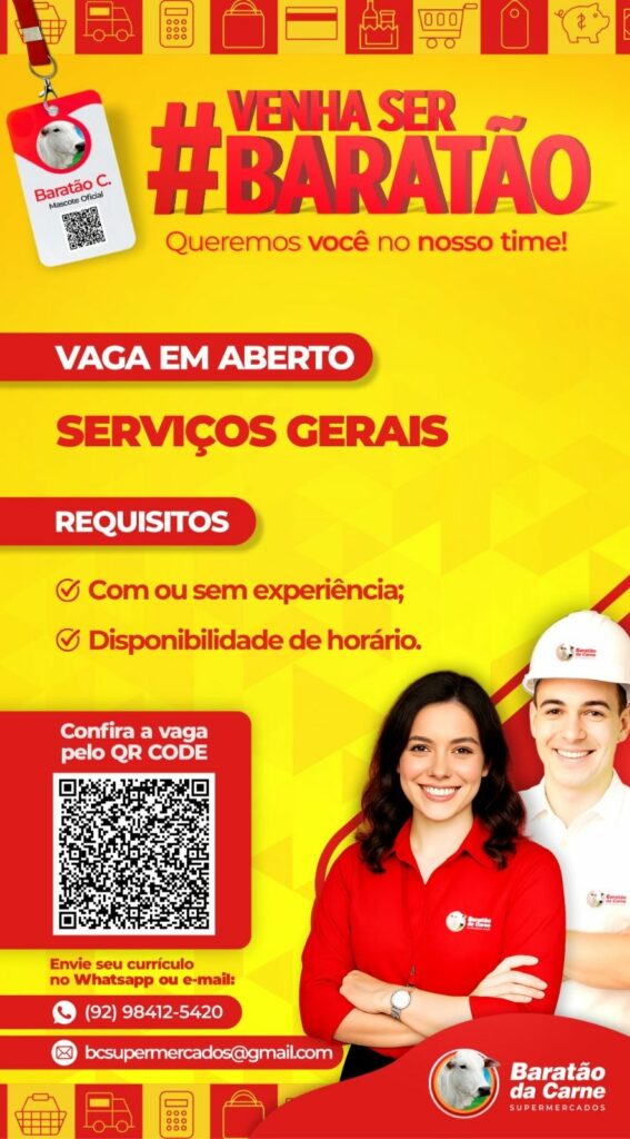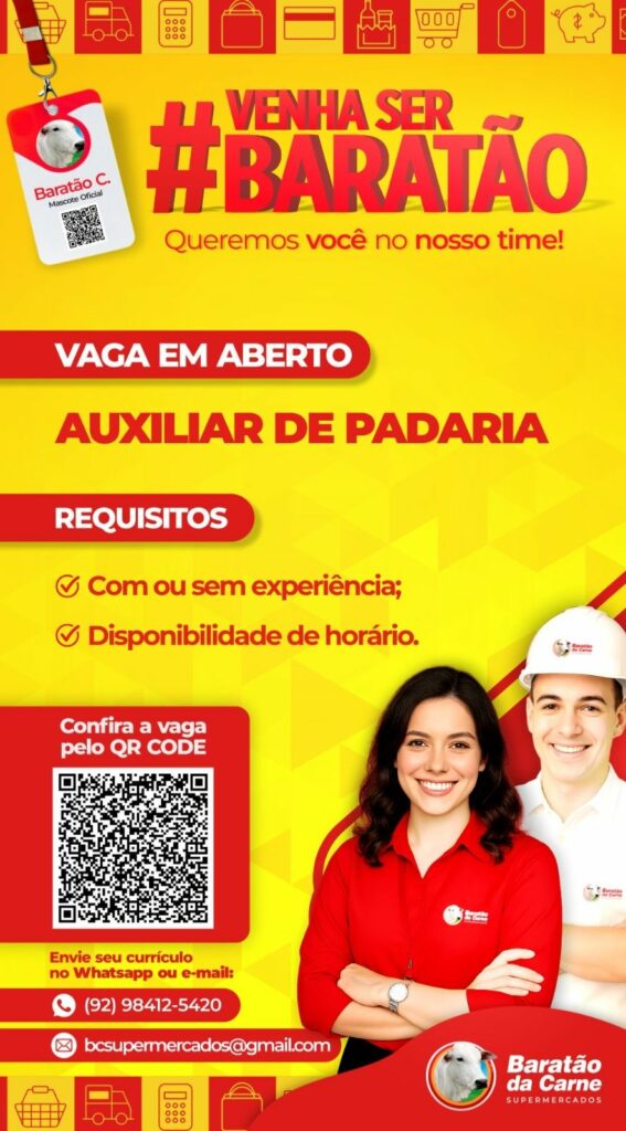Com ou sem experiência! Baratão da carne está selecionando Serviços Gerais, Repositor Hortifruti, Empacotador / Repositor, Operador de caixa, Auxiliar de padaria, Auxiliar de cozinha; Envie seu currículo!