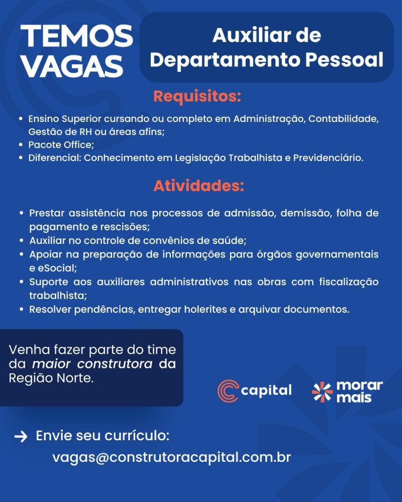 Construtora Capital seleciona Auxiliar de departamento pessoal; Envie seu currículo!
