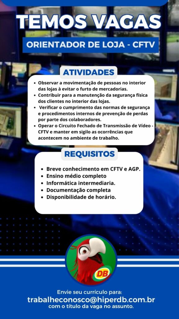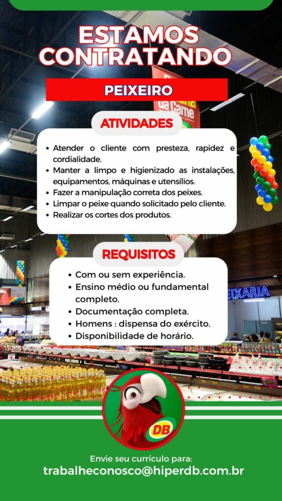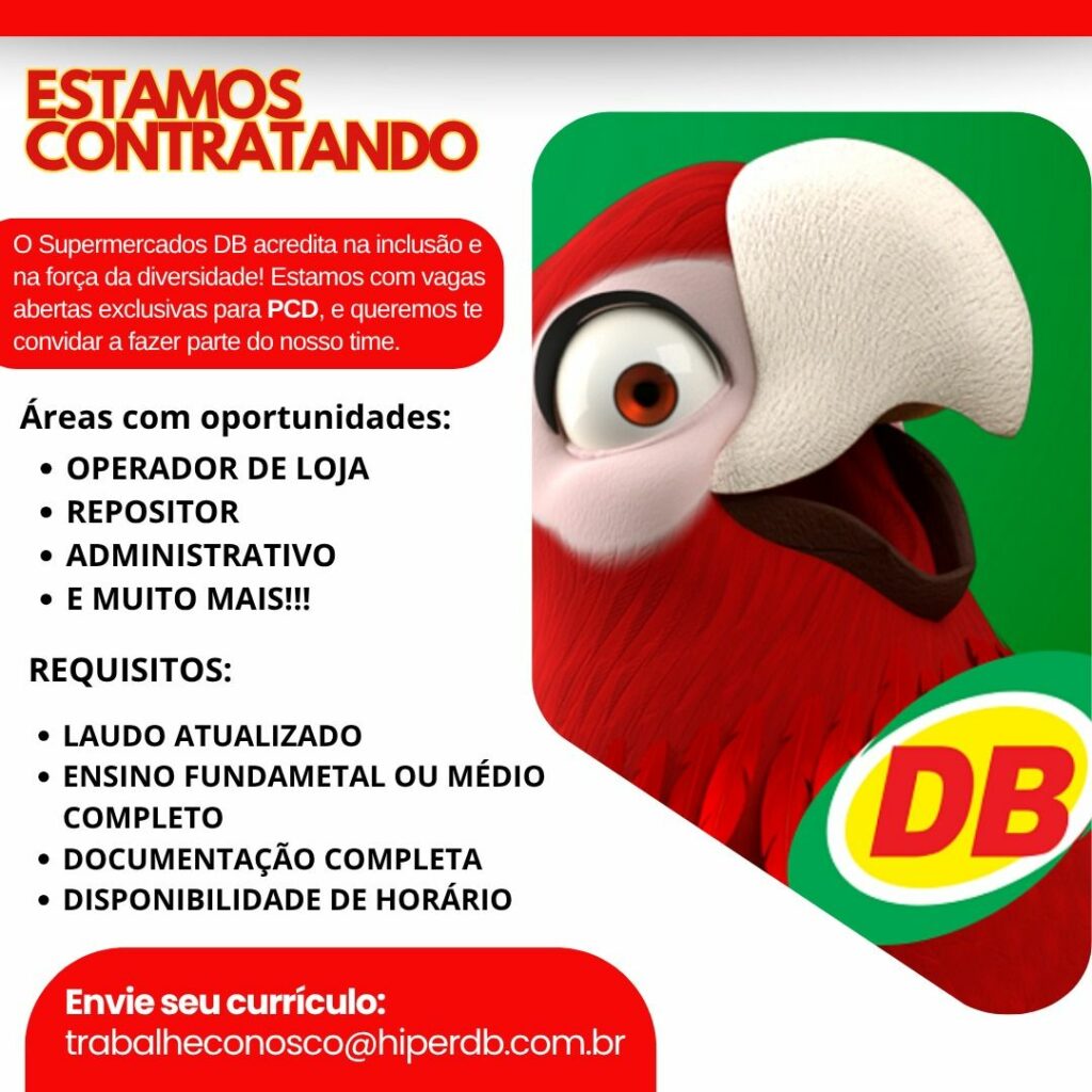 DB supermercados está selecionando Repositor, Operador de loja, Administrativo, Orientador de loja cftv, Atendente de açougue Primeiro Emprego, Repositor primeiro emprego, Operador de caixa primeiro emprego, Auxiliar de cozinha, Peixeiro; Envie seu currículo!