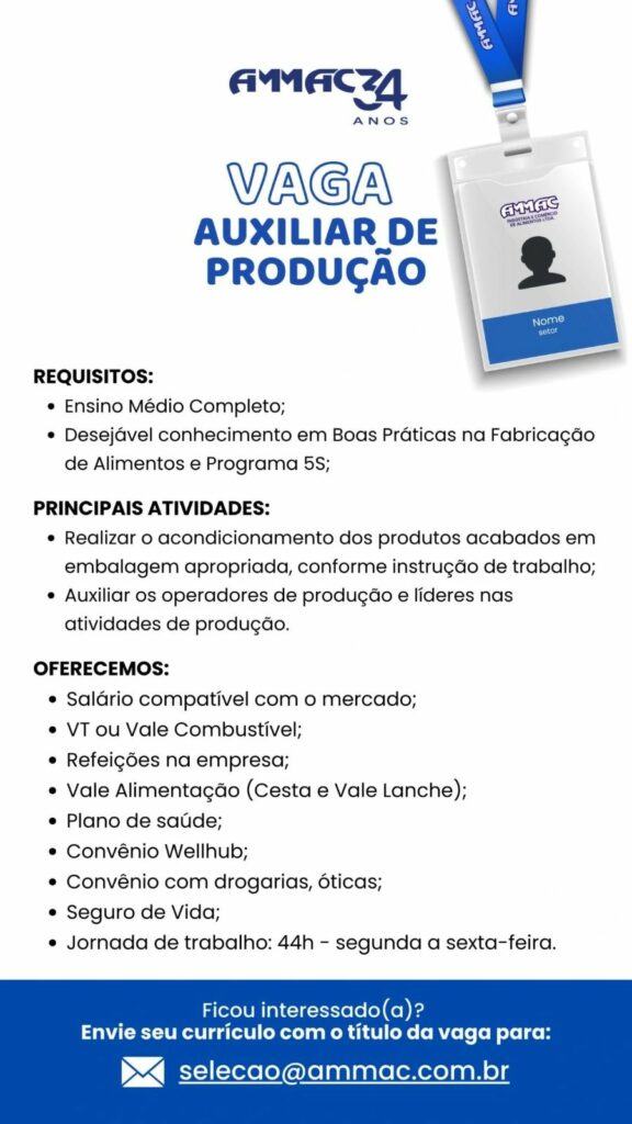 Empresa Ammac está selecionando Auxiliar de produção; Envie seu currículo!