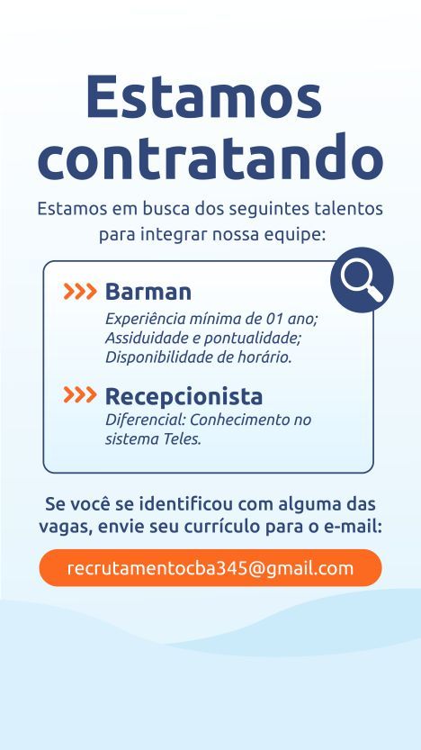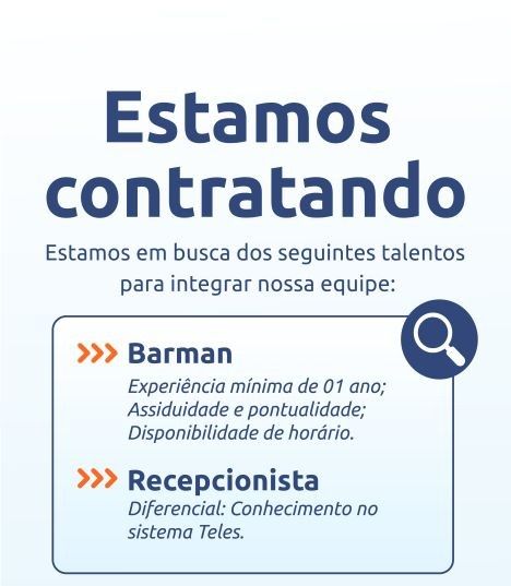 Empresa busca para compor seu quadro de colaboradores Barman, Recepcionista; Envie seu currículo!