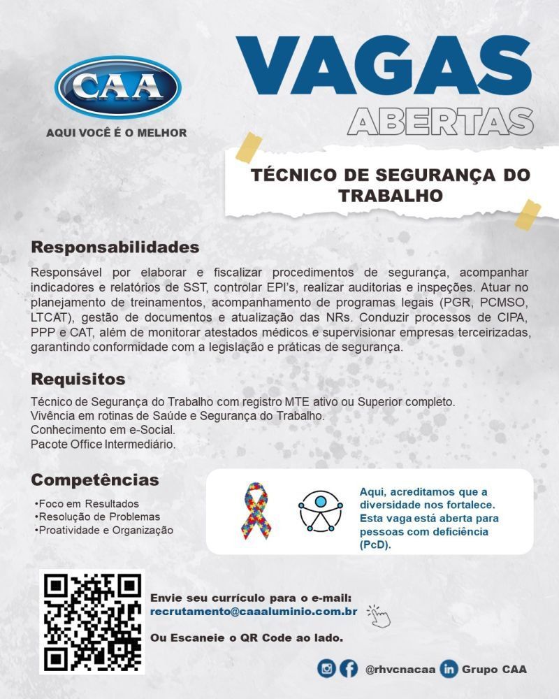 Empresa CAA Alumínio está selecionando Técnico de segurança do trabalho; Envie seu currículo!