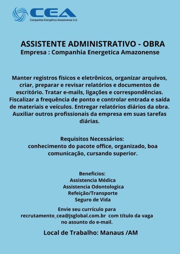 Empresa está selecionando Assistente administrativo de obra; Envie seu currículo!
