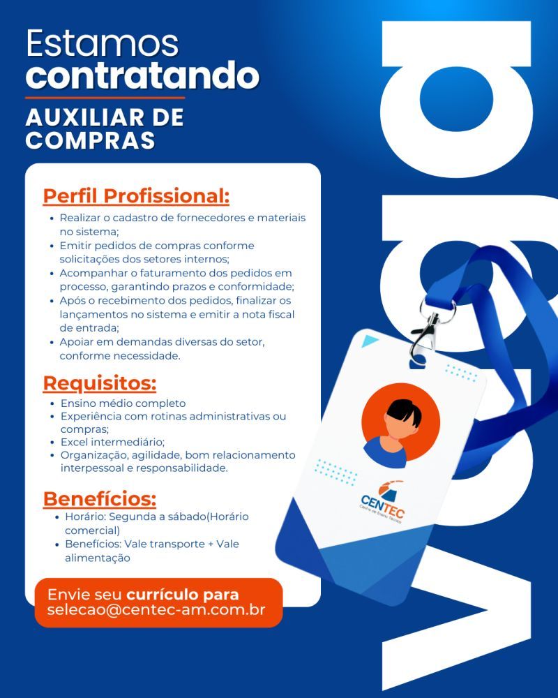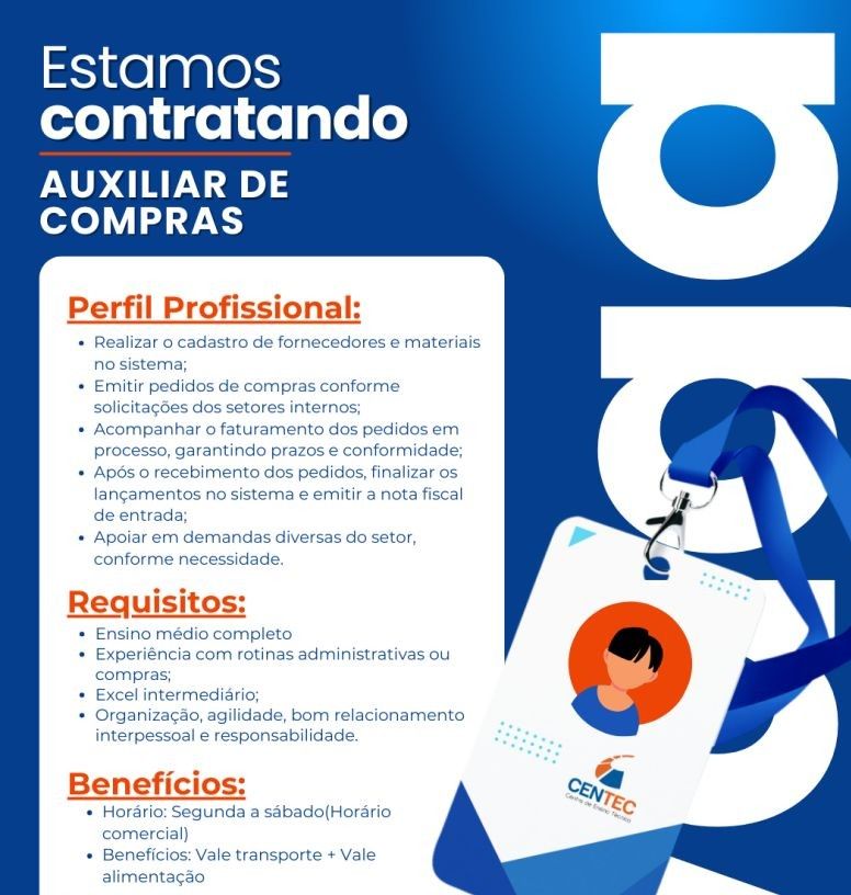 Empresa está selecionando Auxiliar de compras; Envie seu currículo!