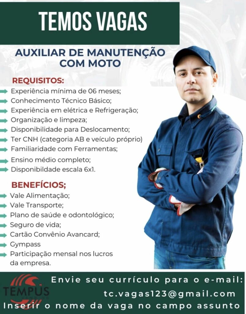 Empresa está selecionando Auxiliar de Manuntenção com moto; Envie seu currículo!