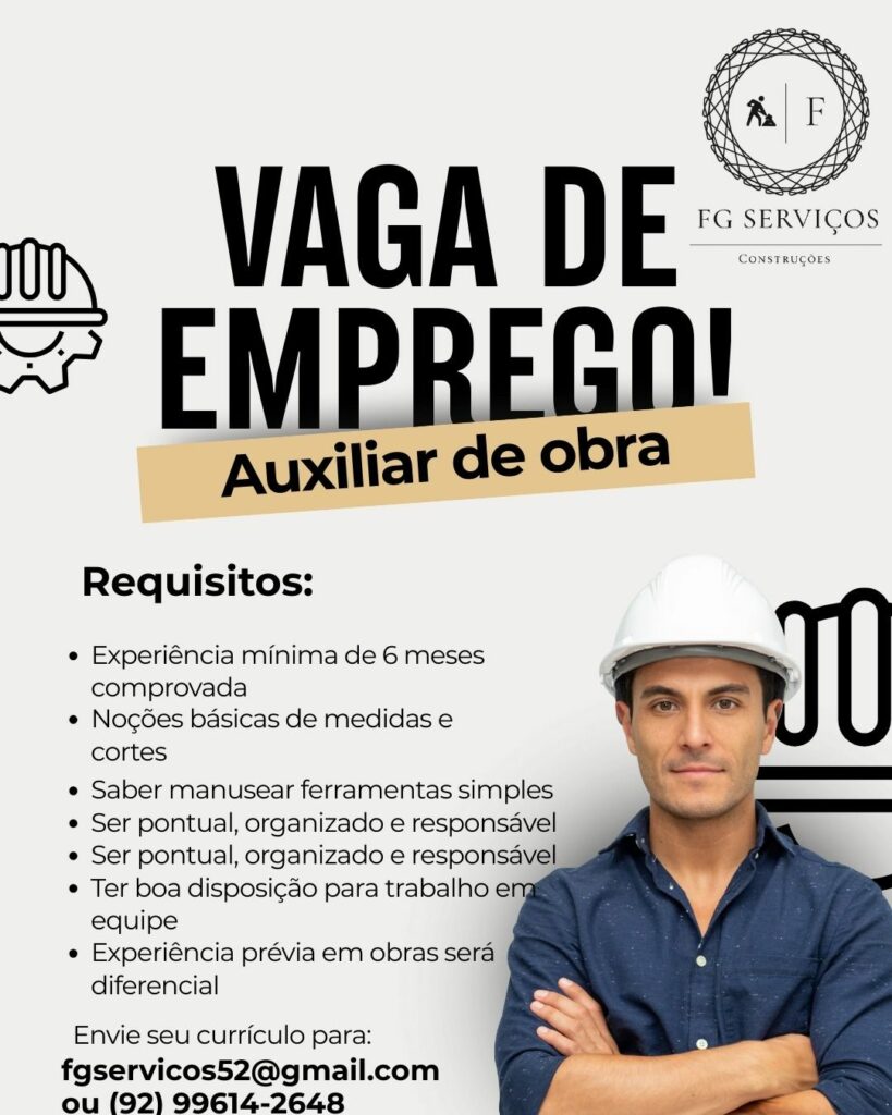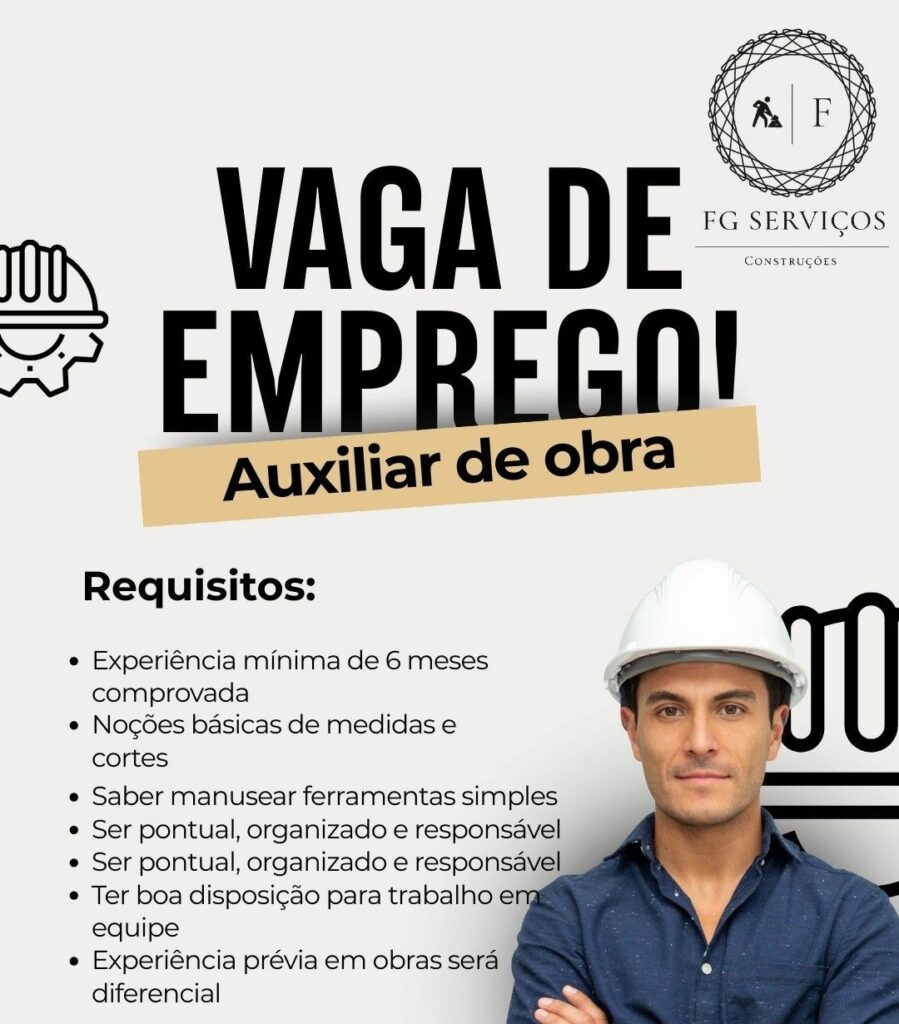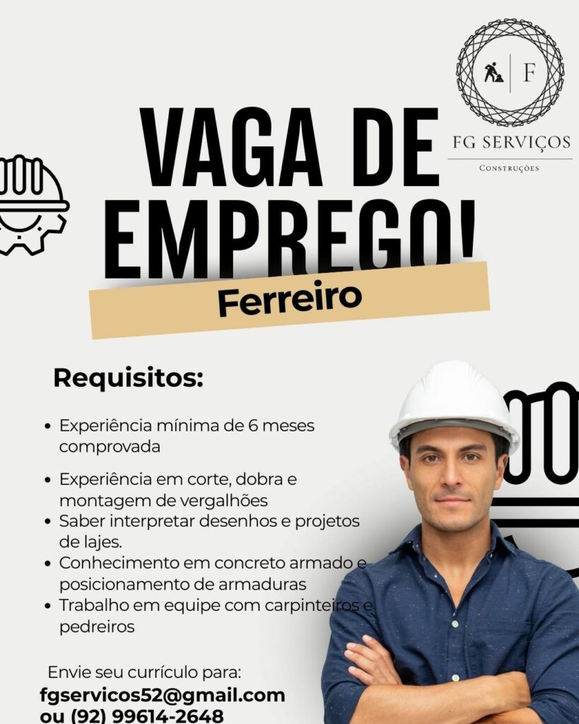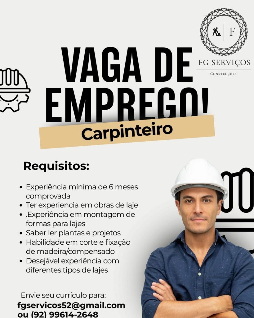 Empresa está selecionando Auxiliar de obra, Carpinteiro, Ferreiro; Envie seu currículo!