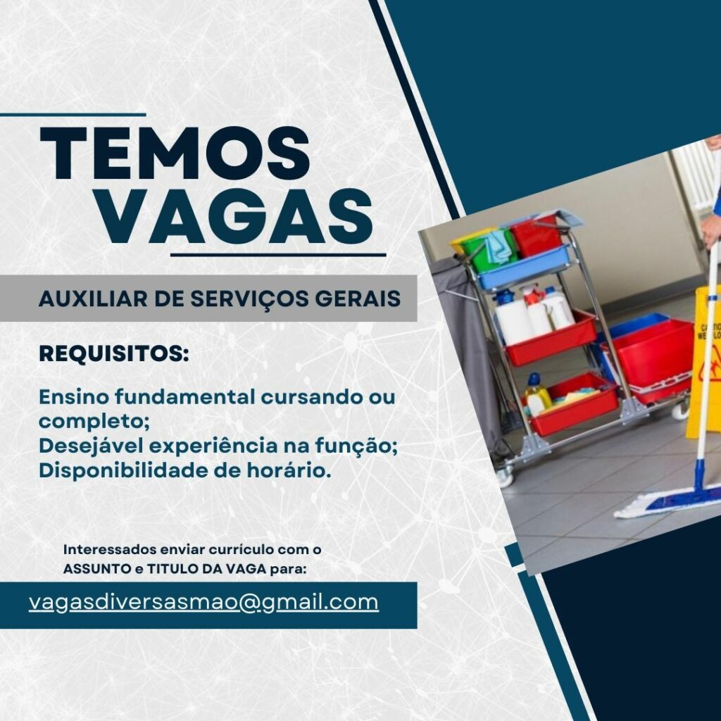 Empresa seleciona para vaga de Auxiliar de serviços gerais; Envie seu currículo!