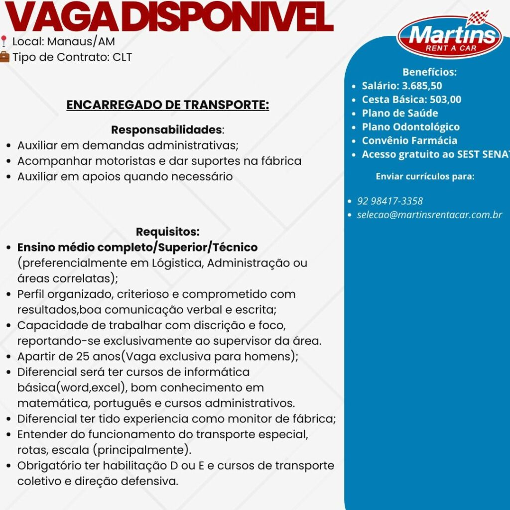 Empresa está selecionando Encarregado de transporte; Envie seu currículo!