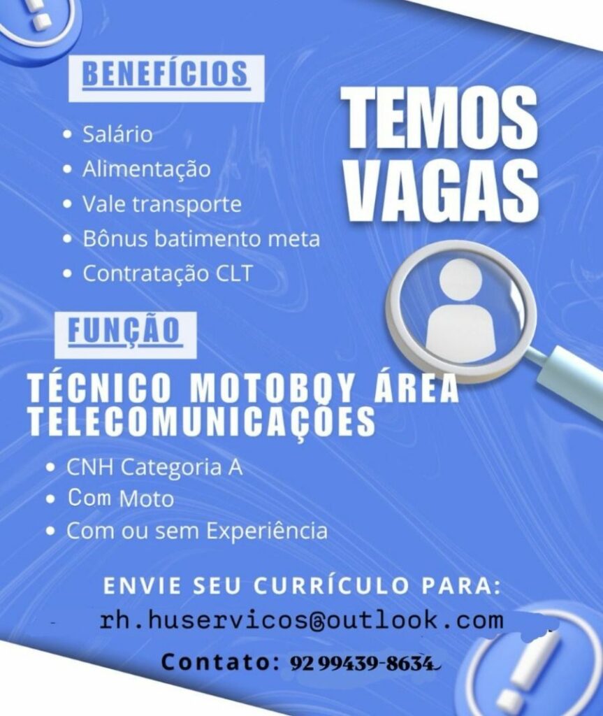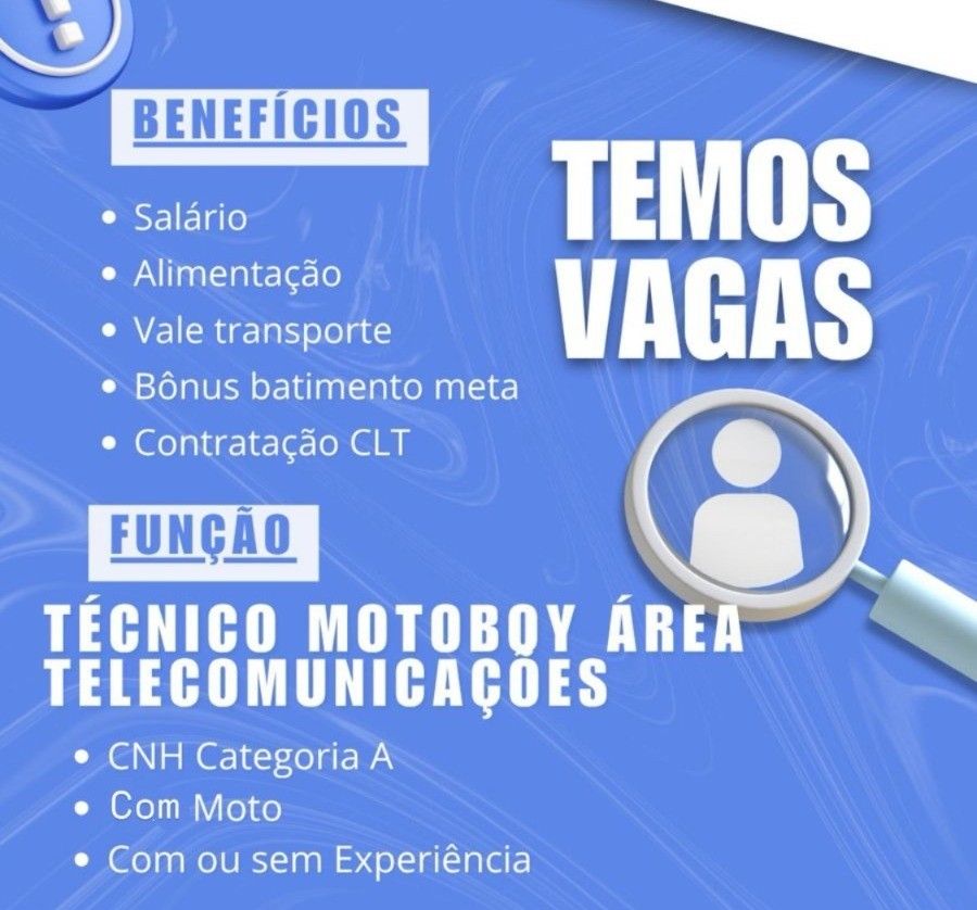 Empresa está selecionando Técnico Motoboy área telecomunicações; Envie seu currículo!