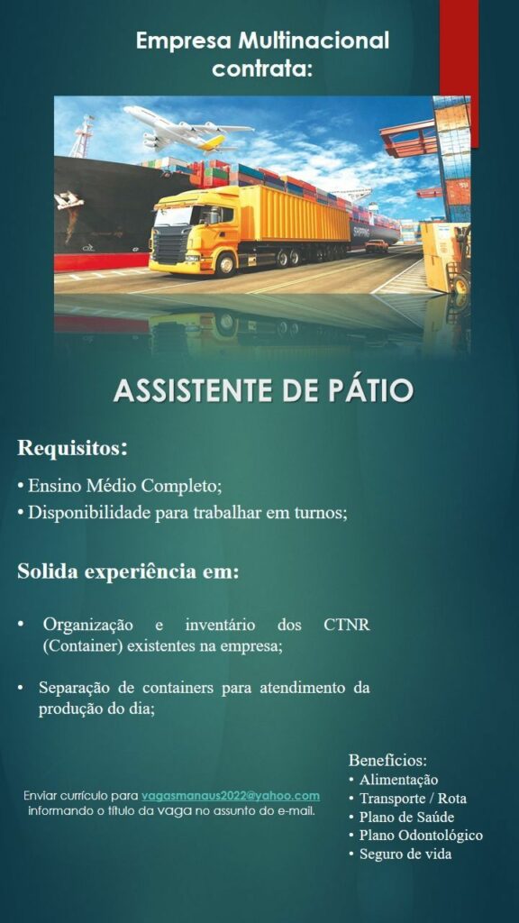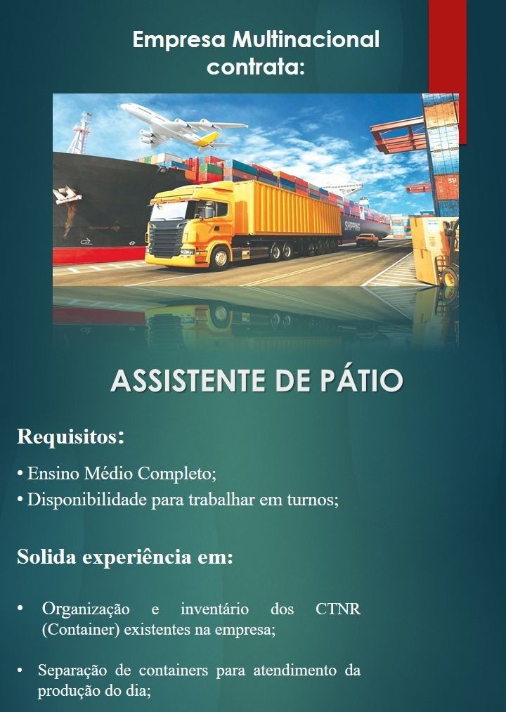Empresa Multinacional seleciona Assistente de pátio; Envie seu currículo!
