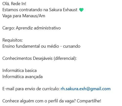 O processo seletivo para esta(s) vaga(s) não cobra absolutamente nada pela sua candidatura. Portanto, jamais aceite qualquer tipo de cobrança para cadastrar seu currículo.