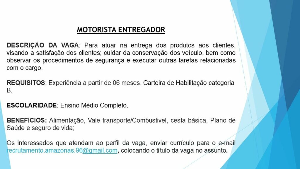 Empresa seleciona Motorista  Entregador; Envie seu currículo!
