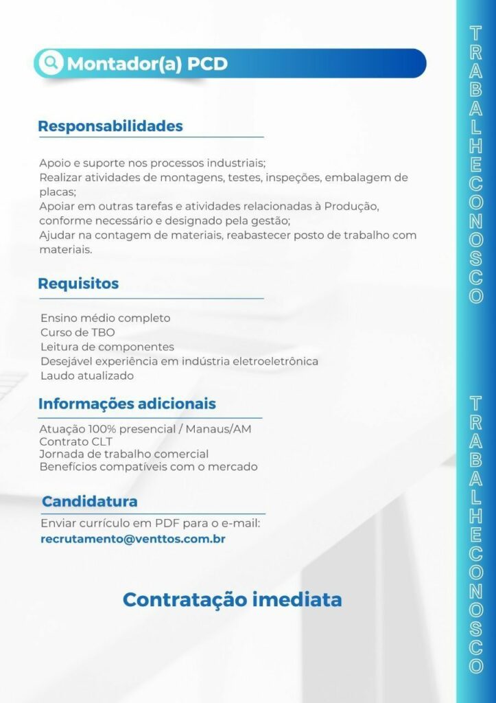 Empresa Venttos electronics seleciona Montador (a); Envie seu currículo!