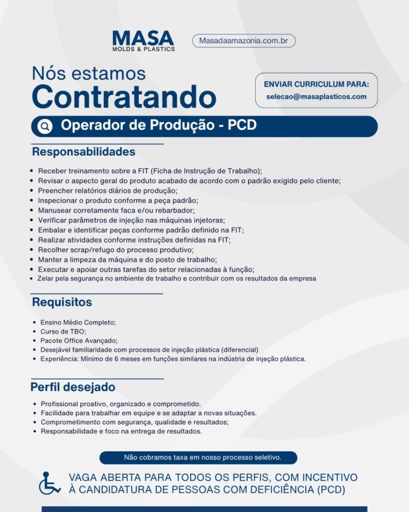 Fábrica da Masa molds & plastics está selecionando Auxiliar de produção; Envie seu currículo!
