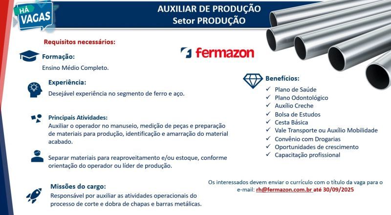 Fermazon indústria está selecionando Auxiliar de produção; Envie seu currículo!