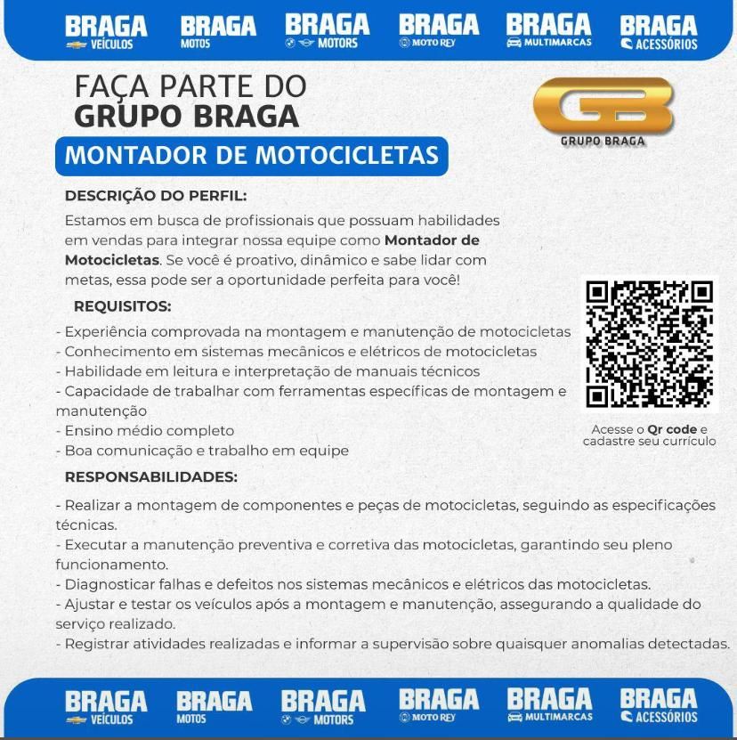 Grupo Braga está selecionando Montador de motocicletas; Envie seu currículo!