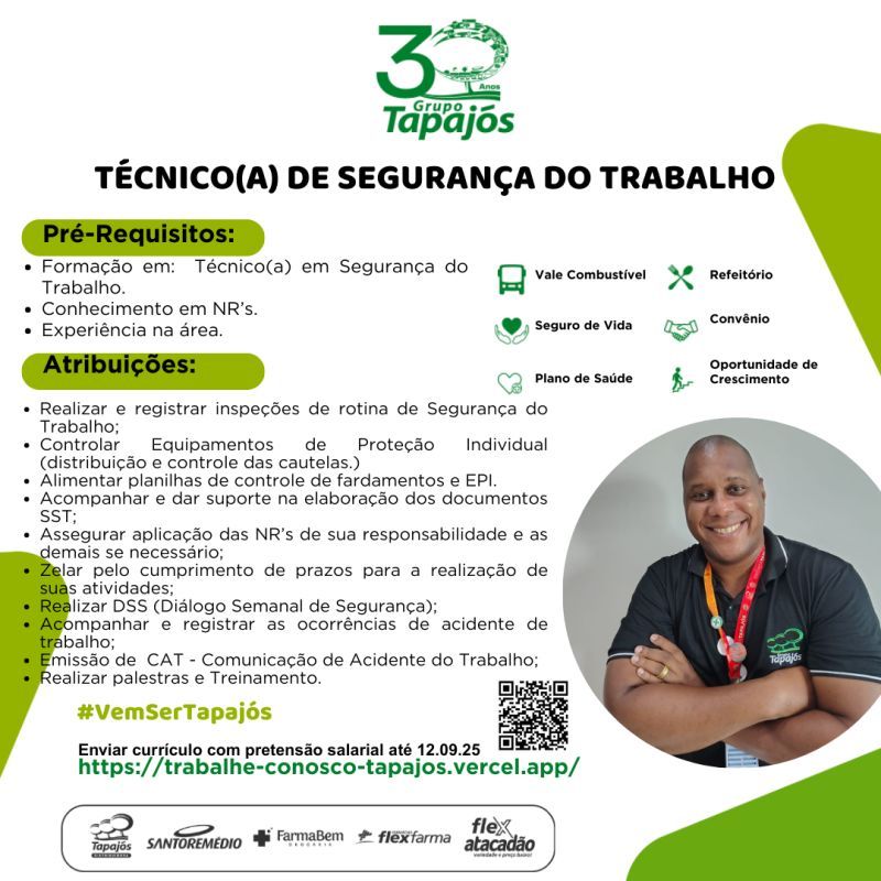 Grupo Tapajós seleciona Técnico (a) de segurança do trabalho; Envie seu currículo!