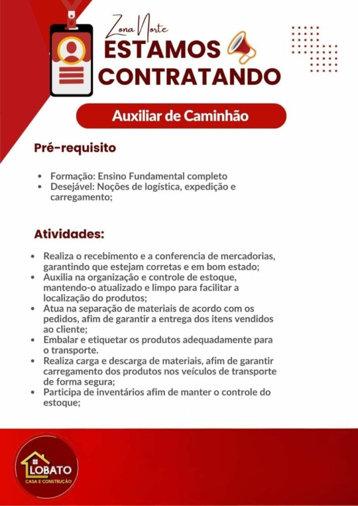 Lobato casa e construção seleciona Auxiliar de caminhão (08 vagas); Envie seu currículo!