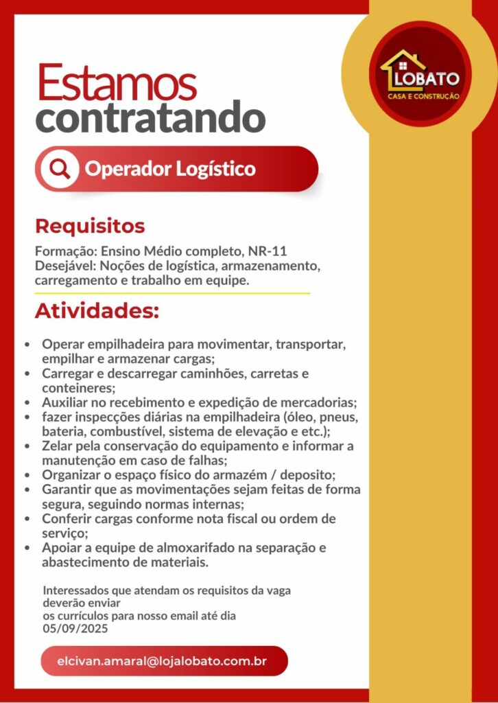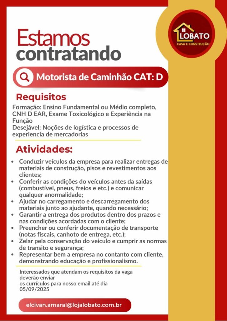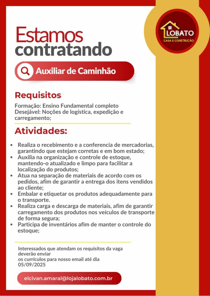 Lobato casa e construção seleciona Auxiliar de caminhão, Motorista de caminhão Cat D, Operador logístico; Envie seu currículo!