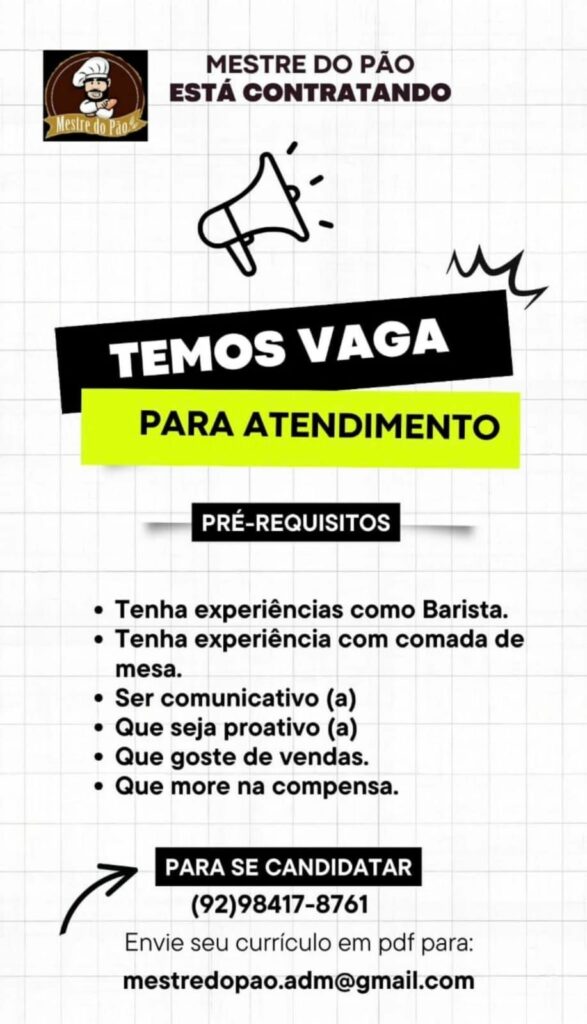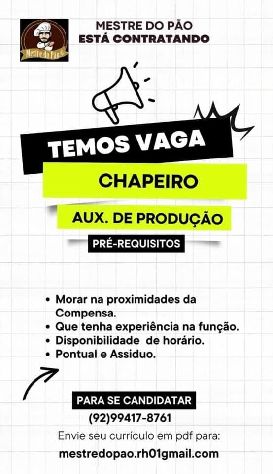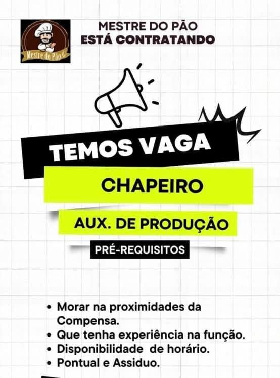 Mestre do pão está selecionando Chapeiro Auxiliar de Produção, Atendente; Envie seu currículo!