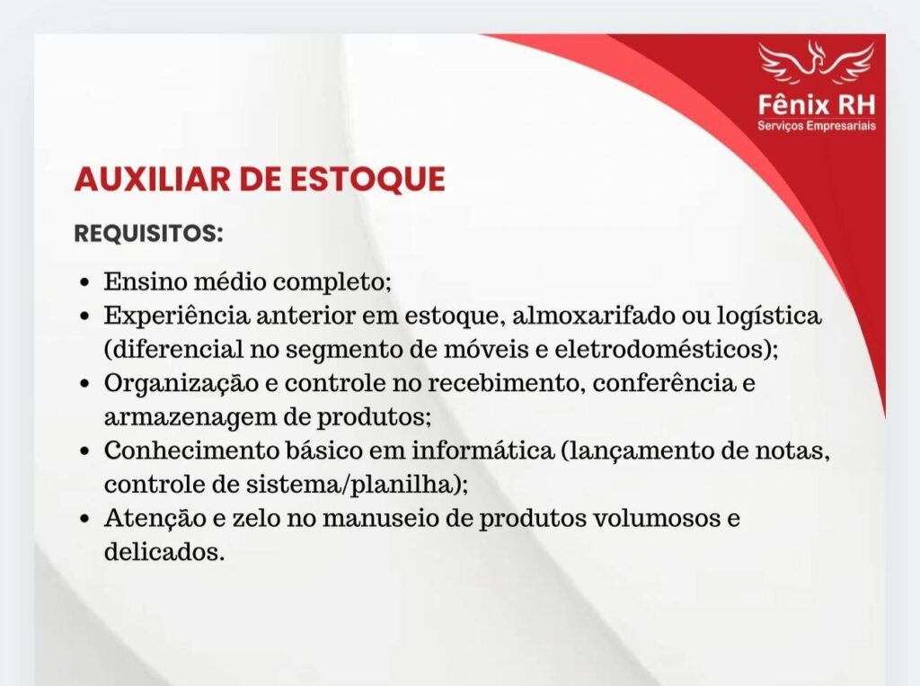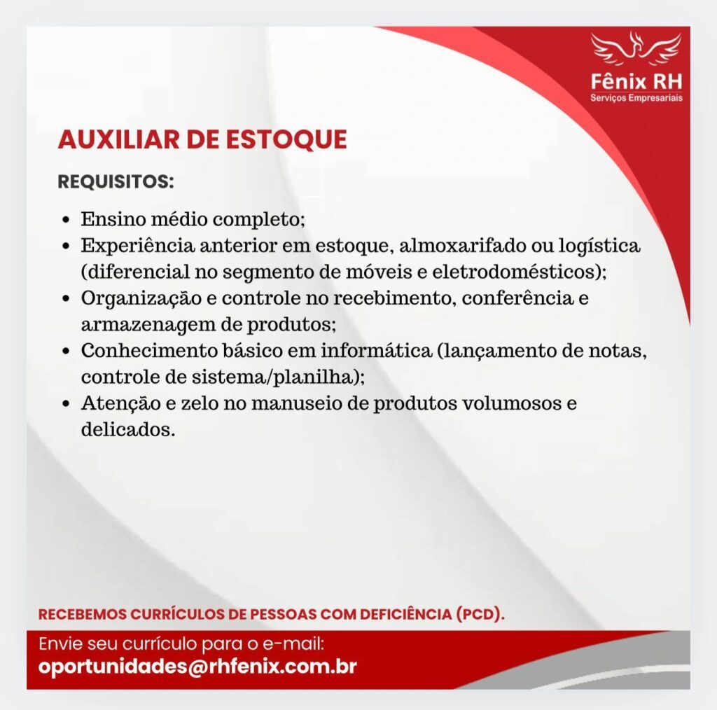 Rh está selecionando Auxiliar de estoque; Envie seu currículo!
