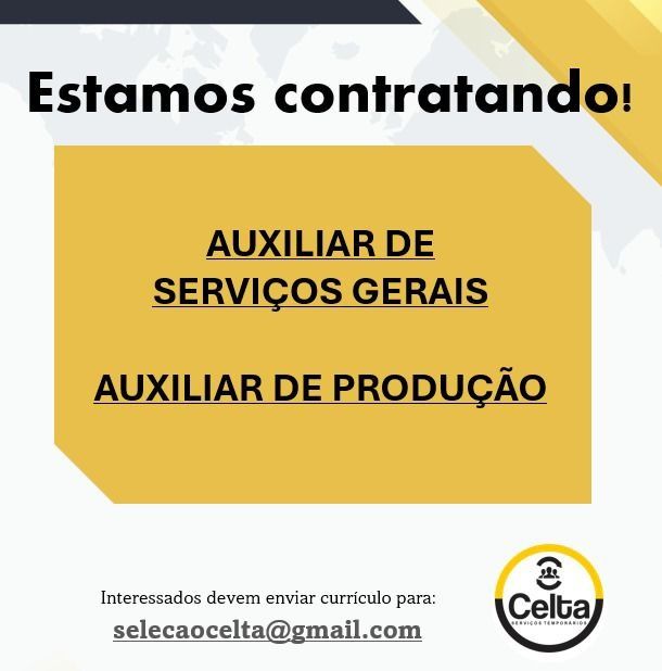 Rh está selecionando Auxiliar de produção, Auxiliar de serviços gerais; Envie seu currículo!