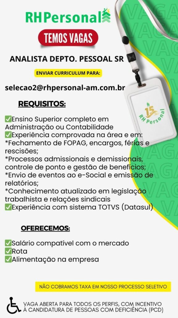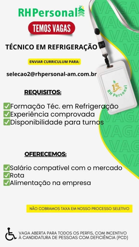 Rh está selecionando Técnico em Refrigeração, Analista departamento pessoal sr; Envie seu currículo!