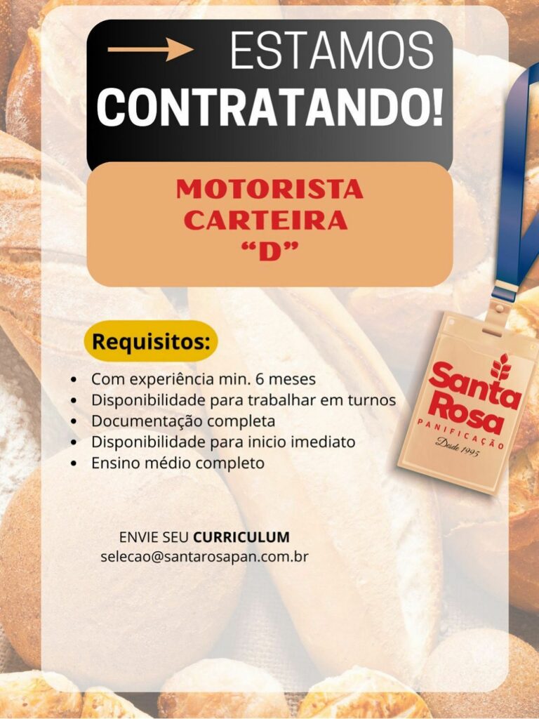 Santa Rosa panificação está selecionando Motorista; Envie seu currículo!
