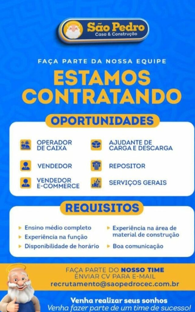 São Pedro casa e construção está selecionando Operador de caixa, Vendedores, Ajudante de carga e descarga, Repositor, Serviços Gerais; Envie seu currículo!