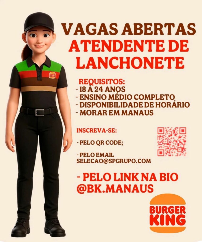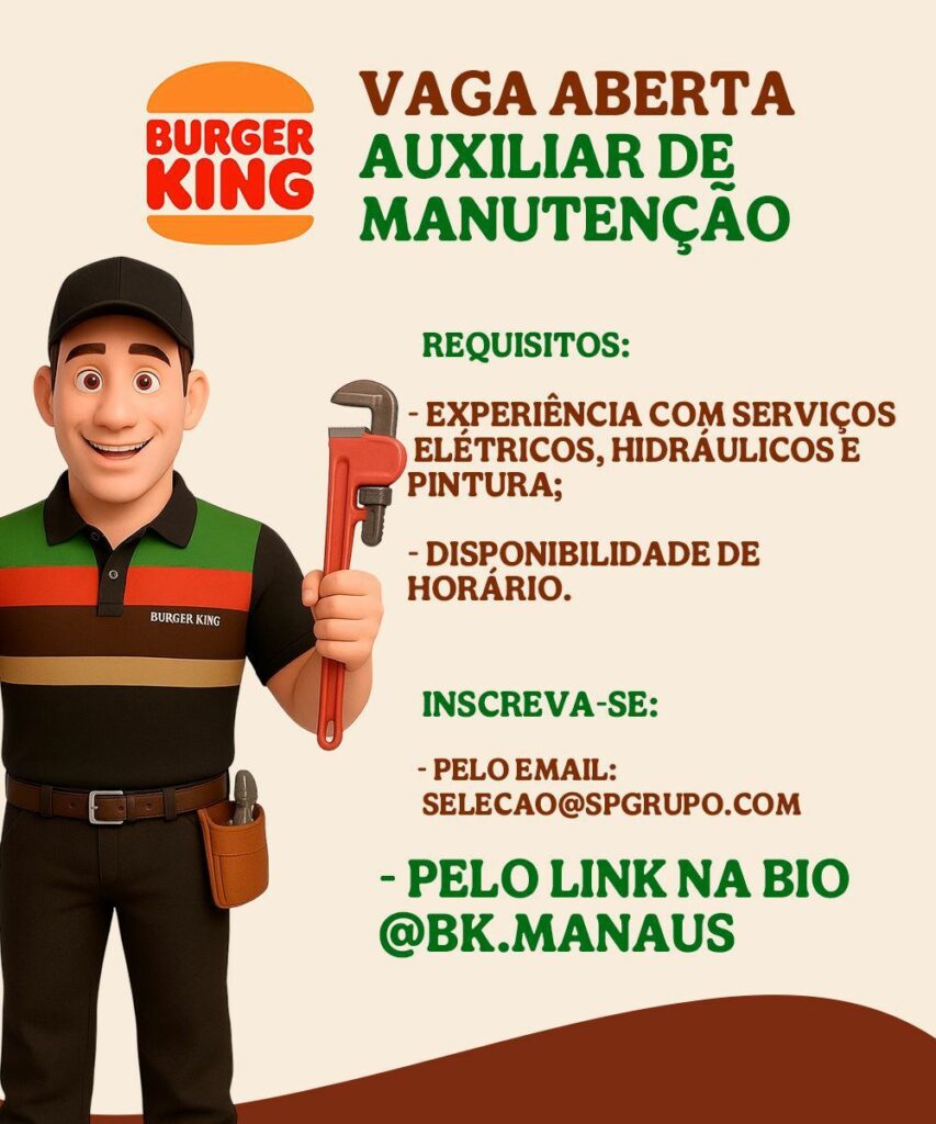 Seleção para seguintes vagas Auxiliar de manutenção, Atendente de lanchonete; Envie seu currículo!