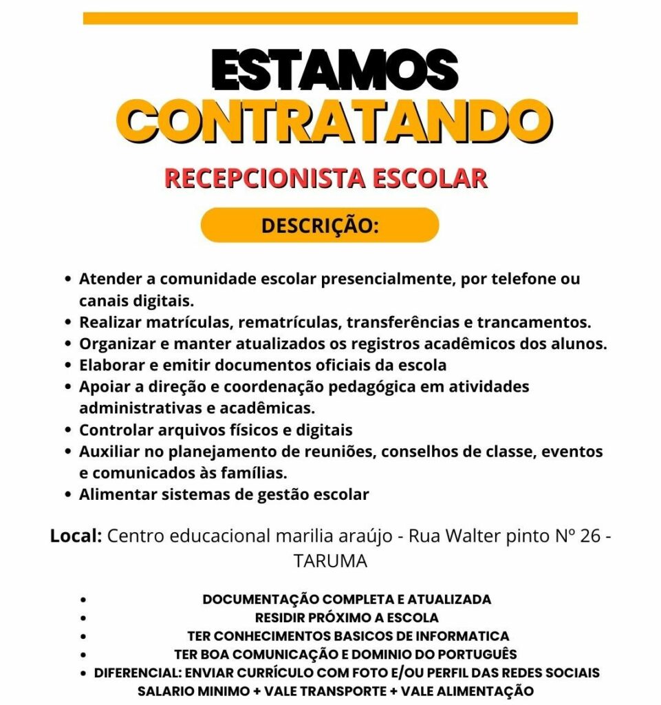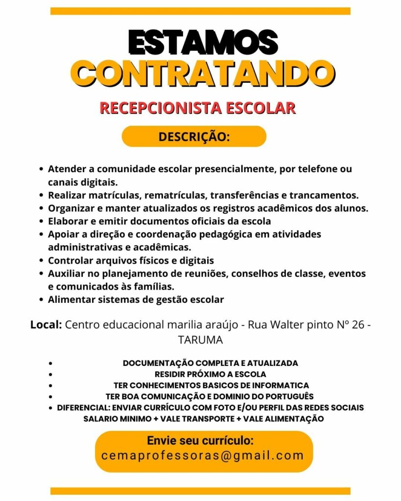 Seleção para vaga de Recepcionista escolar; Envie seu currículo!