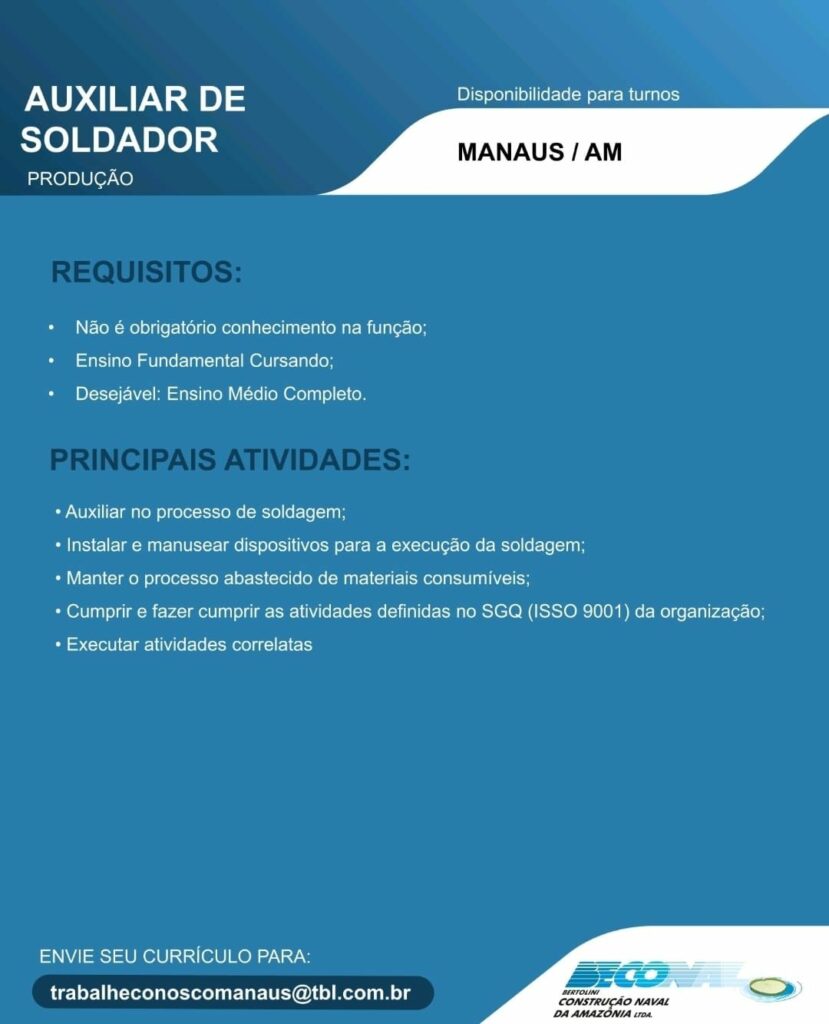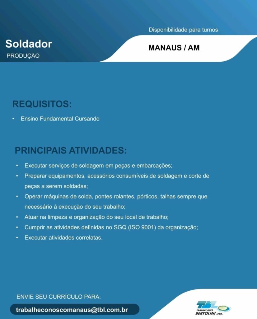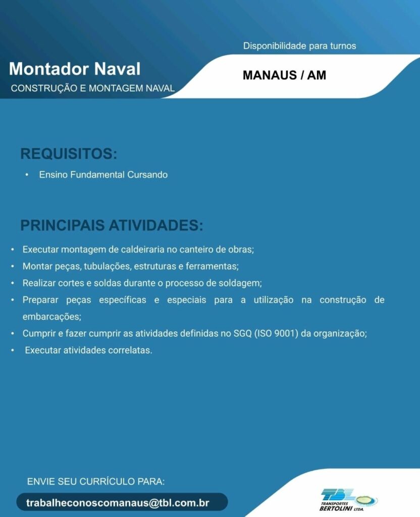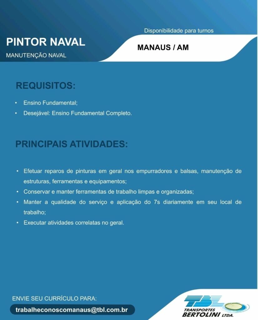 Transporte Bertolini Ltda seleciona Auxiliar de operações, Torneiro mecânico, Pintor Naval, Auxiliar de Soldador, Ajudante Montador Naval, Soldador, Montador Naval, Mecânico, Auxiliar de serviços gerais; Envie seu currículo!