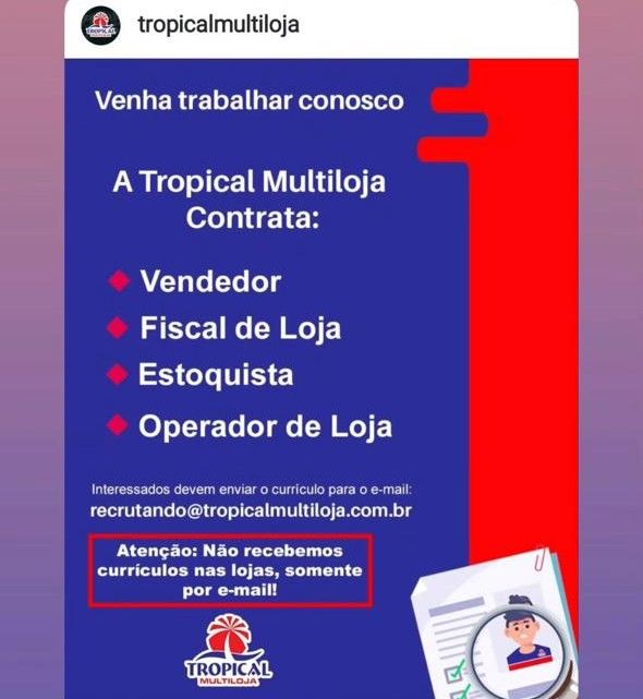 Tropical Multiloja seleciona Vendedor, Fiscal de loja, Estoquista, Operador de loja; Envie seu currículo!