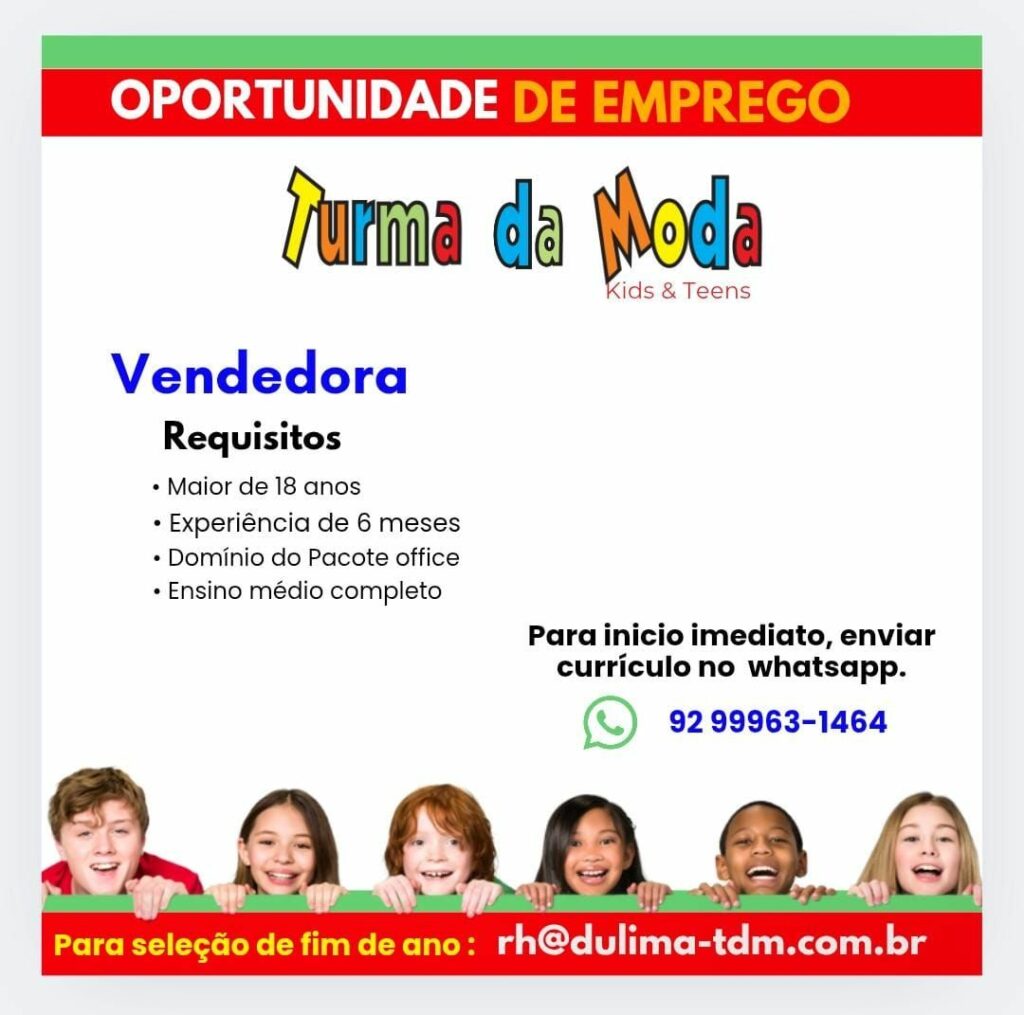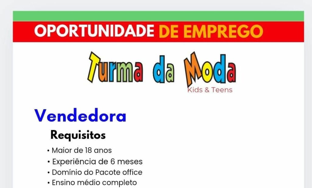 Turma da moda está selecionando Vendedora; Envie seu currículo!