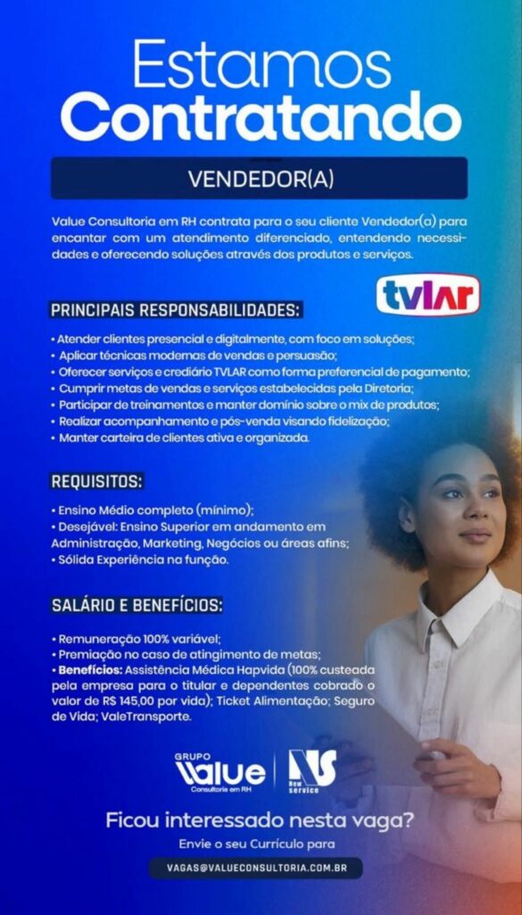 TV lar está selecionando Vendedor (a); Envie seu currículo!