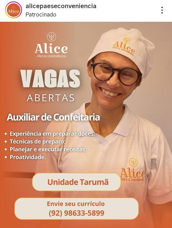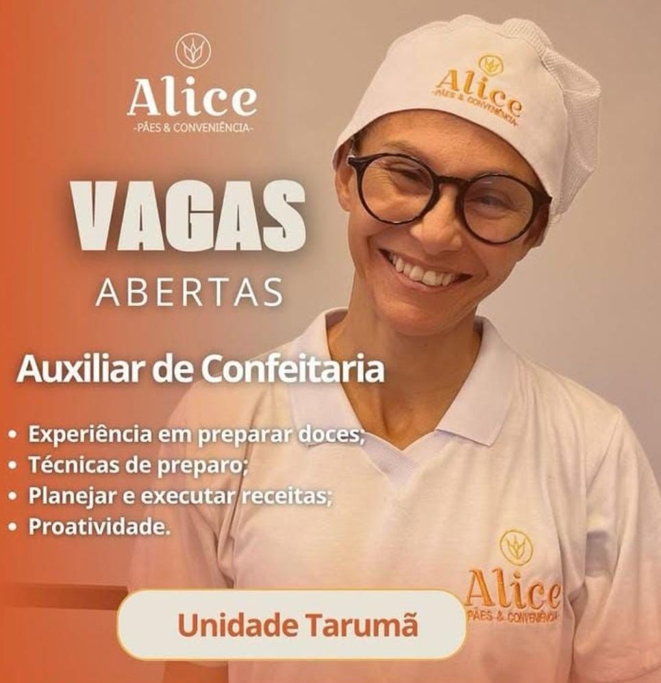 Alice pães e conveniência seleciona Auxiliar de confeitaria; Envie seu currículo!