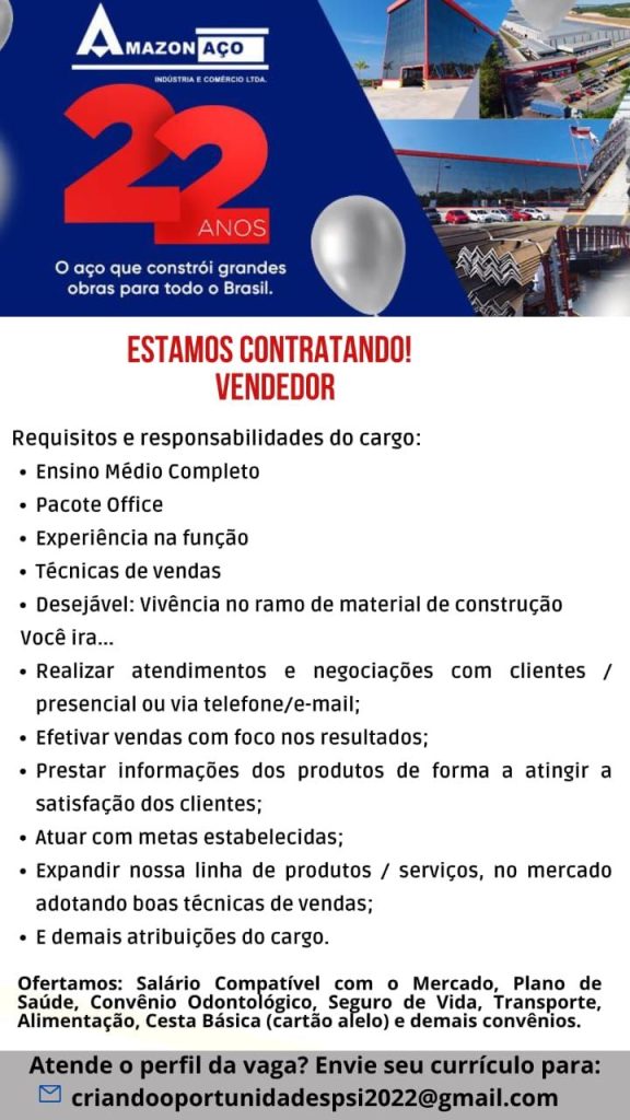 Amazon Aço está selecionando Vendedor; Envie seu currículo!