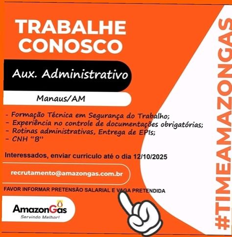 AmazonGás está selecionando Auxiliar administrativo; Envie seu currículo!