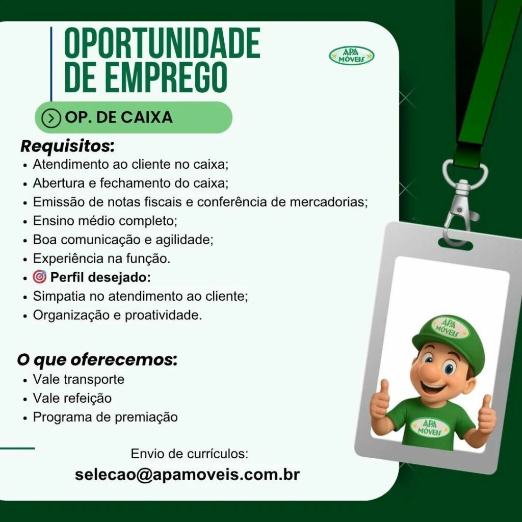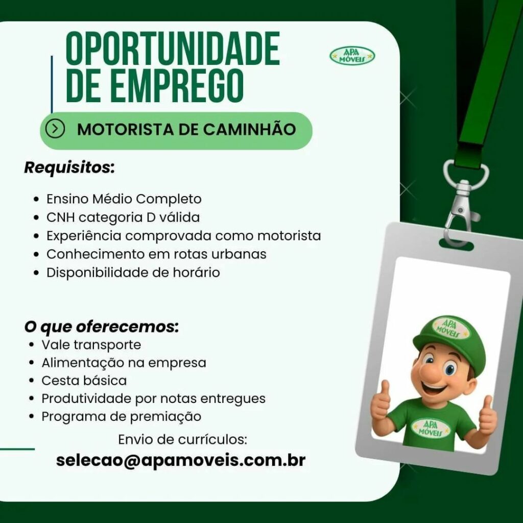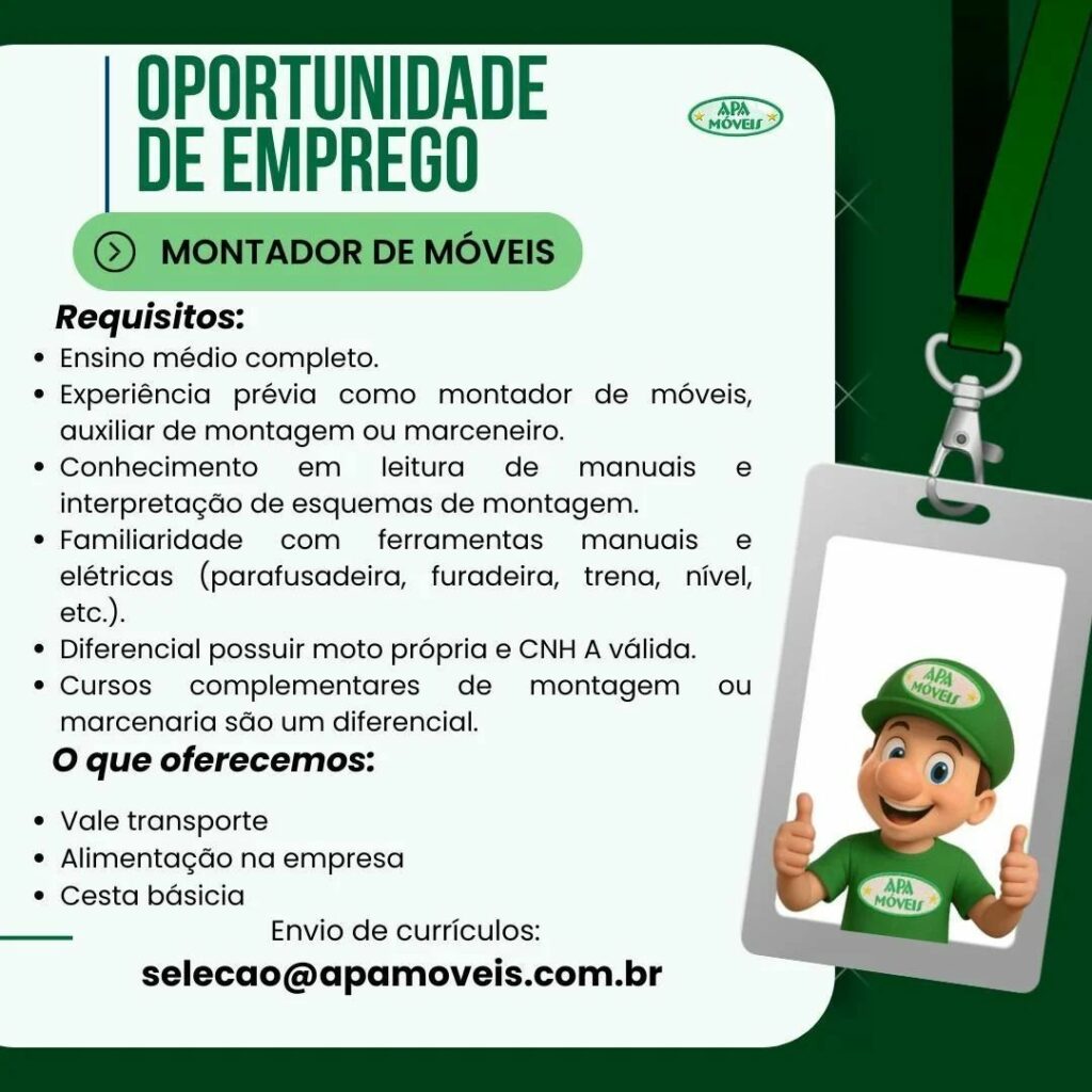 Apa Móveis está selecionando Ajudante de carga e descarga, Motorista de caminhão, Conferente, Agente de portaria, Operador de telemarketing, Operador de caixa, Vendedor de loja, Montador de Móveis; Envie seu currículo!