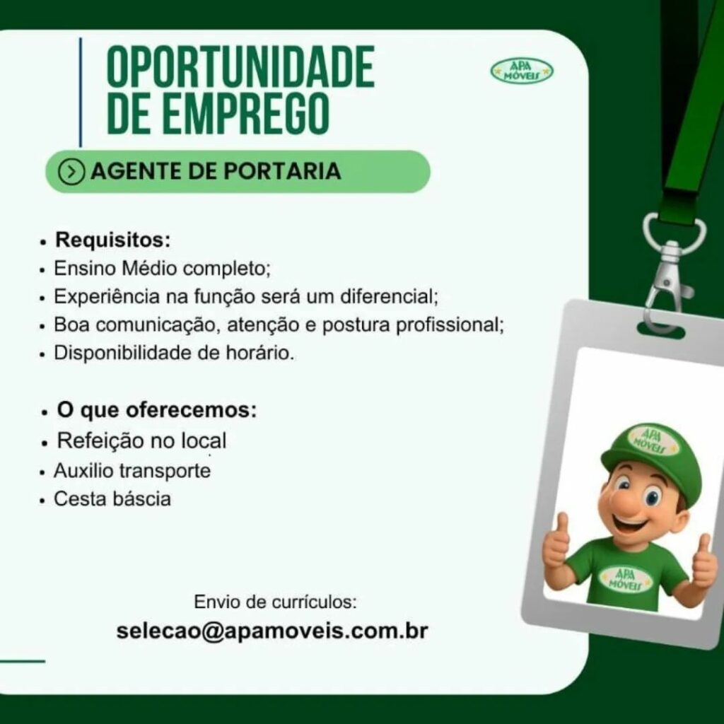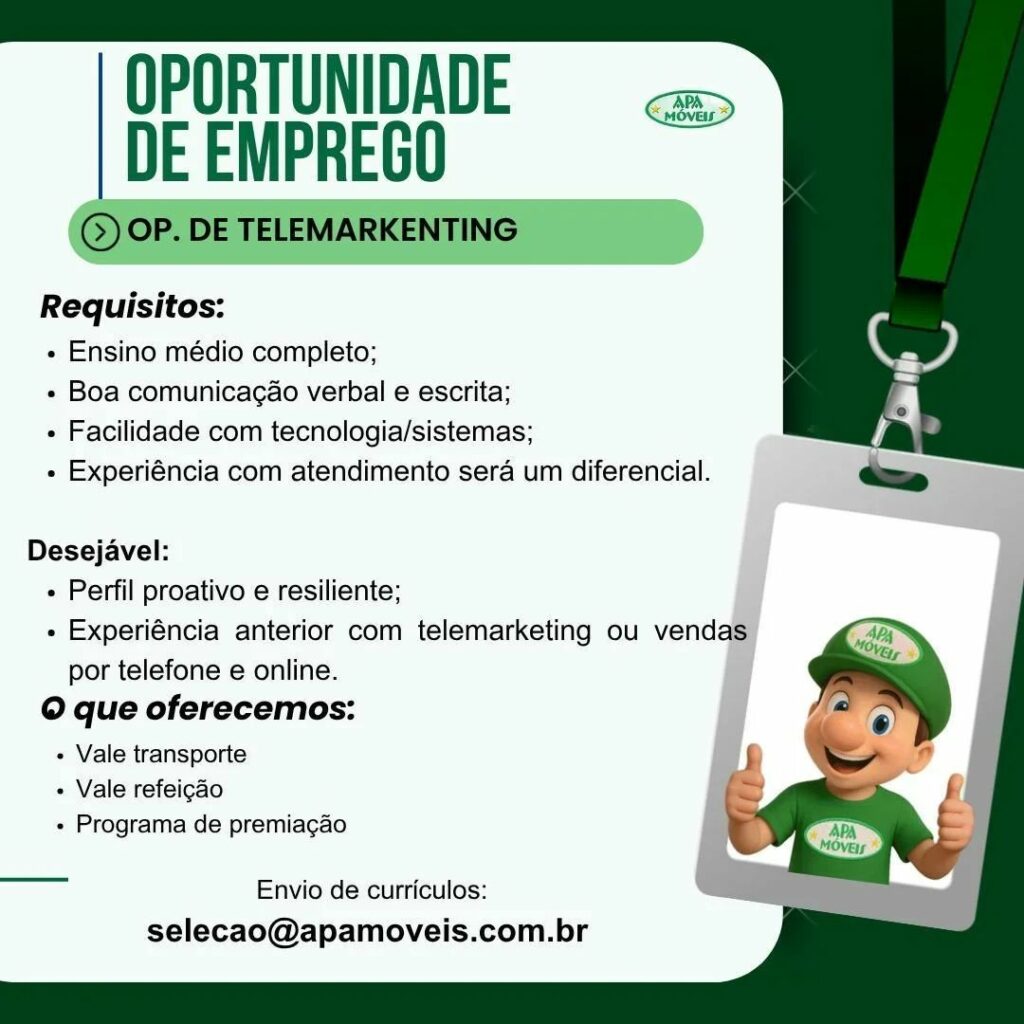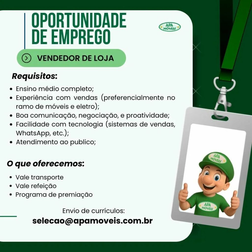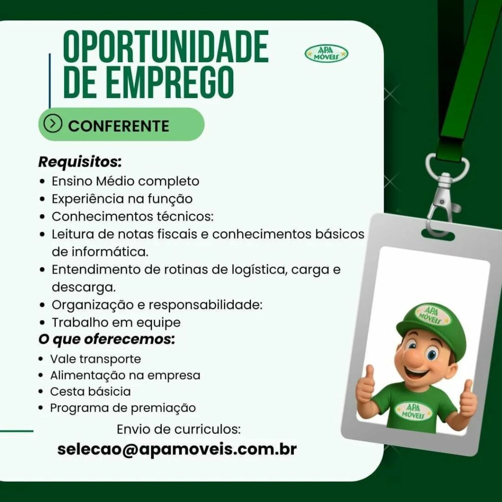 Apa Móveis está selecionando Ajudante de carga e descarga, Motorista de caminhão, Conferente, Agente de portaria, Operador de telemarketing, Operador de caixa, Vendedor de loja, Montador de Móveis; Envie seu currículo!
