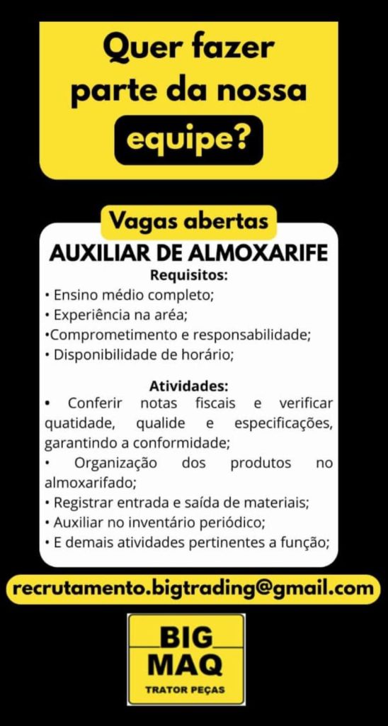 Big maq trator peças seleciona Auxiliar de almoxarife; Envie seu currículo!