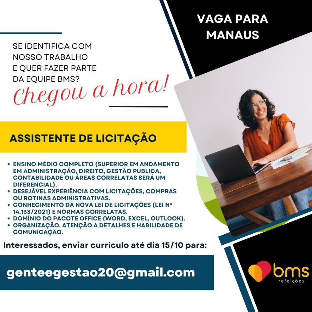 Bms refeições seleciona Assistente de licitação; Envie seu currículo!