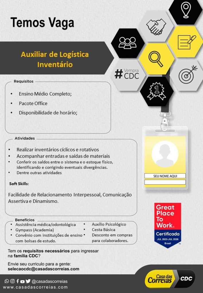 Casa das correias está selecionando Auxiliar de logística inventário; Envie seu currículo!