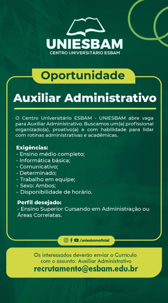 Centro Universitário Esbam seleciona Auxiliar administrativo; Envie seu currículo!