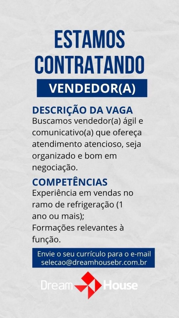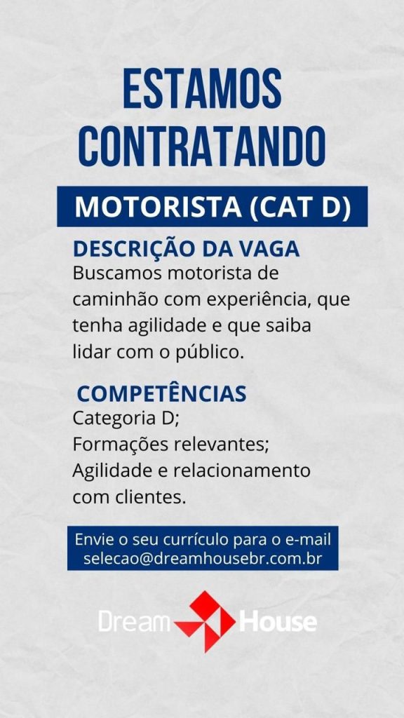 Dream House Seleciona para seguintes vagas Motorista Cat D, Vendedor (a); Envie seu currículo!