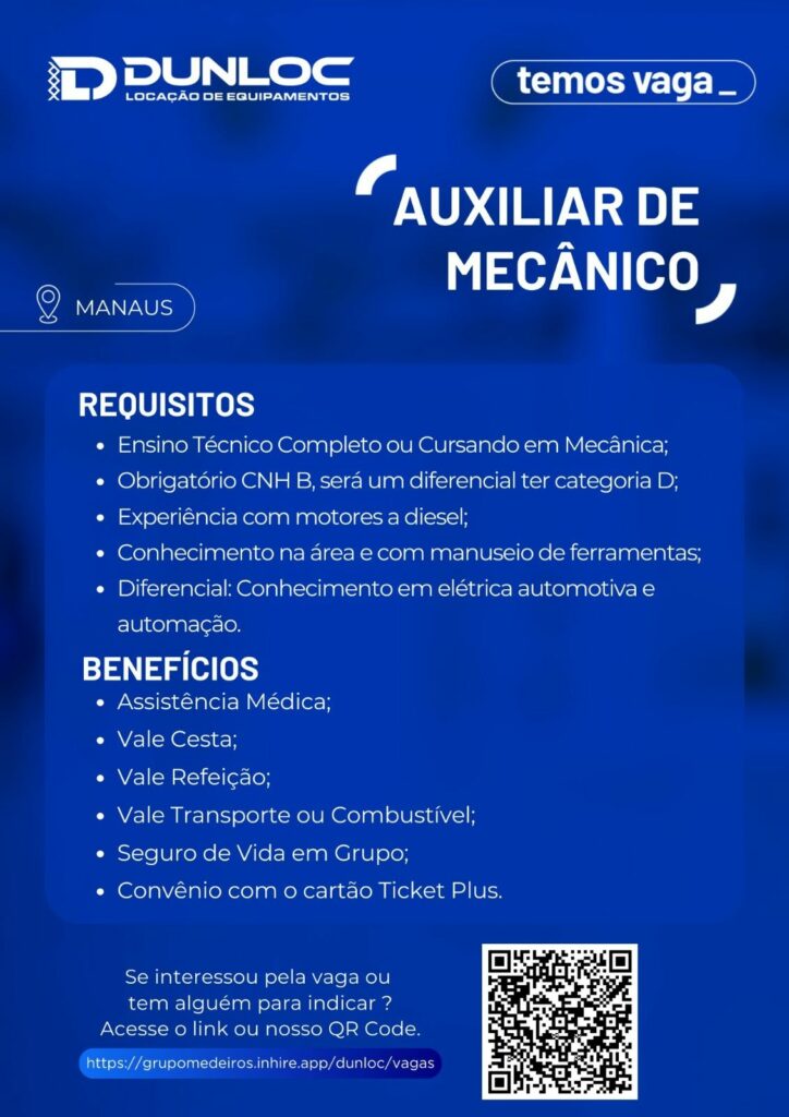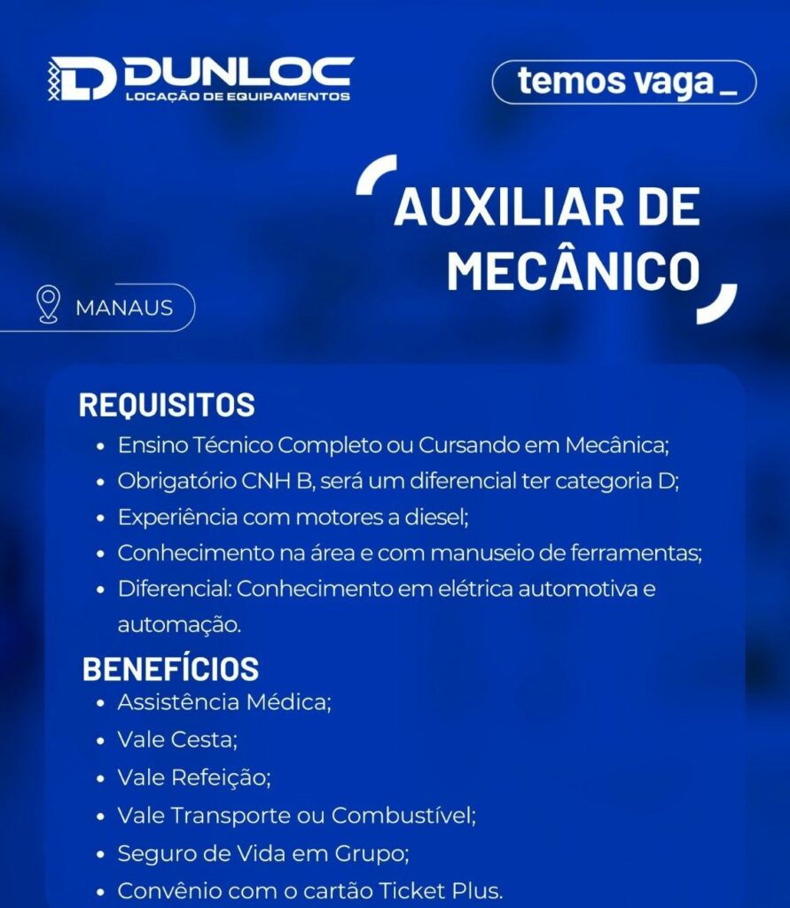 Dunloc está selecionando Auxiliar mecânico; Envie seu currículo!