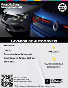 Dunort Renault seleciona Auxiliar mecânico, Lavador de automóveis; Envie seu currículo!