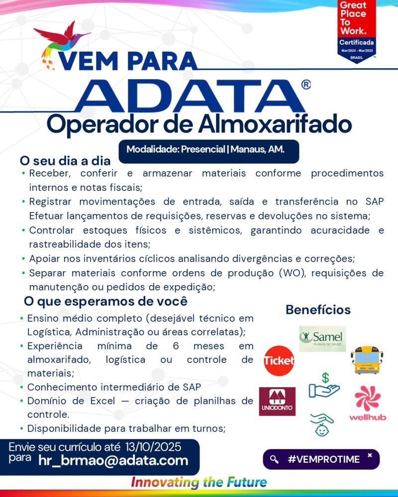 Empresa Adata está selecionando Operador de almoxarifado; Envie seu currículo!