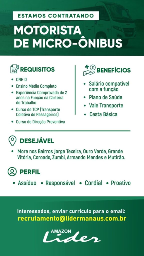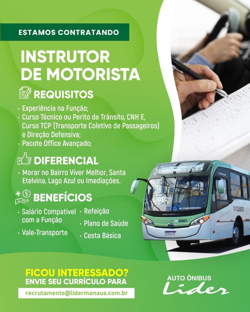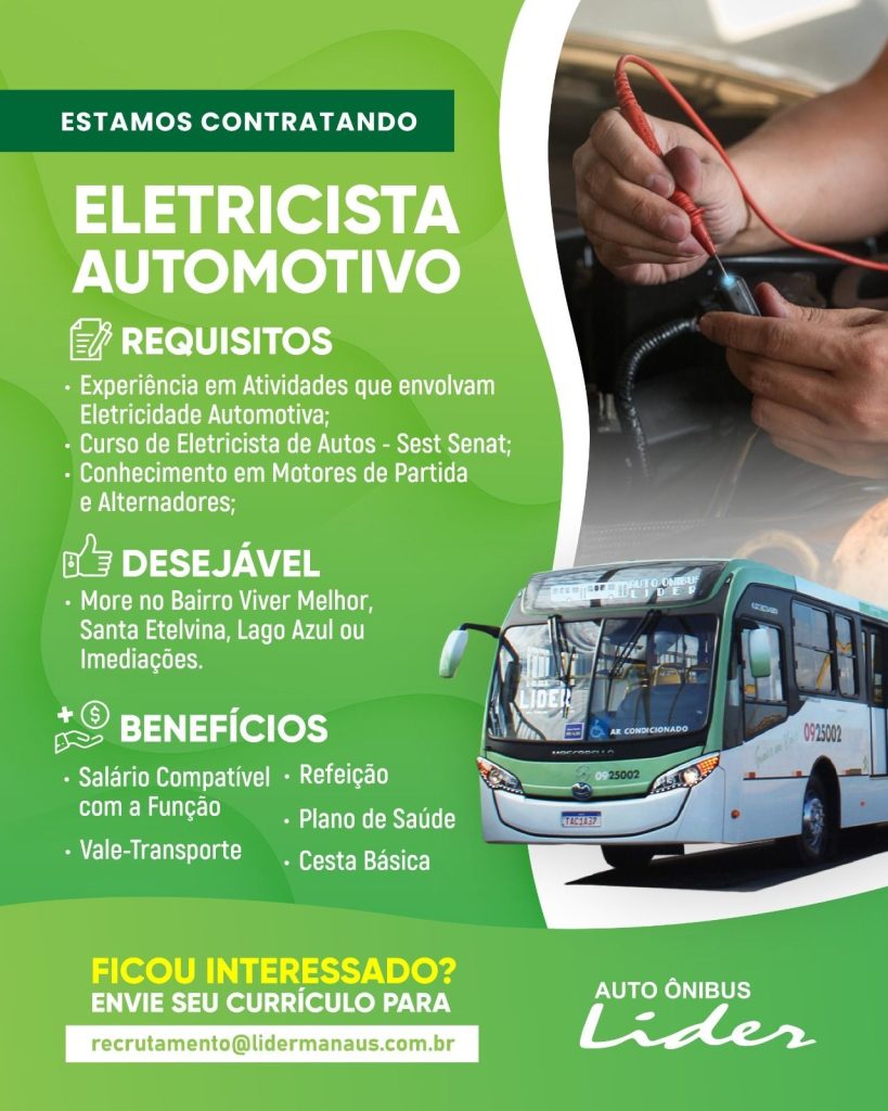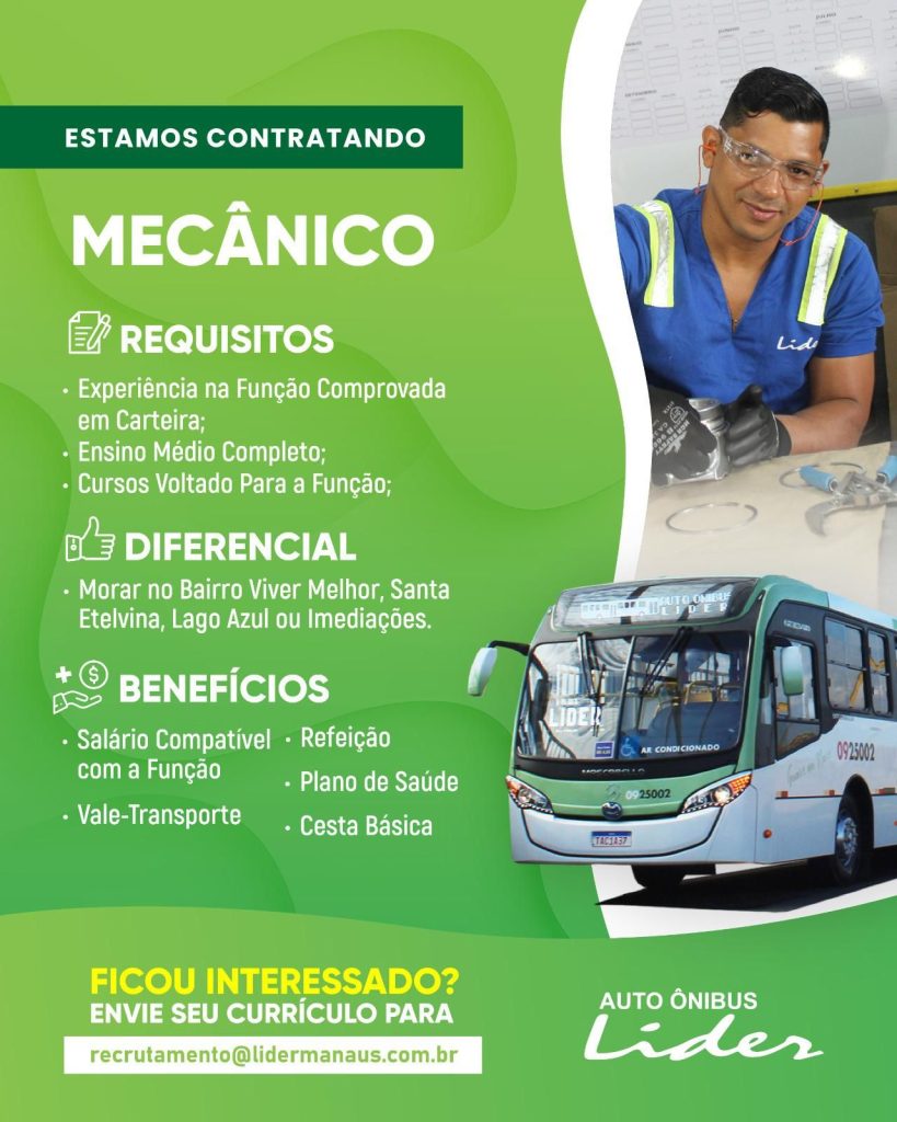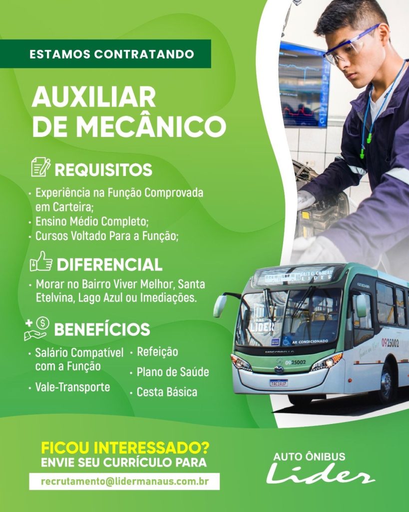 Empresa Auto ônibus Líder seleciona Motorista de micro ônibus, Instrutor de motorista, Auxiliar de mecânico, Eletricista automotivo, Mecânico, Técnico em segurança do trabalho; Envie seu currículo!